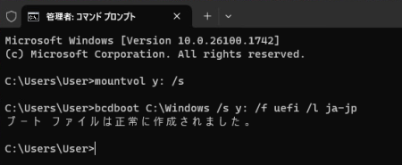 bcdboot C:\Windows /s y: /f uefi /l ja-jp
