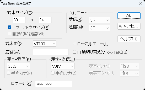 この問題を解決するには、TeraTerm側の文字コード設定をヤマハルーターに合わせて「SJIS」に変更します。手順は以下の通りです。