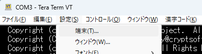 TeraTermのメニューバーから「設定(S)」を選択し、ドロップダウンメニューから「端末(T)…」をクリックします。 - 文字コードを変更する