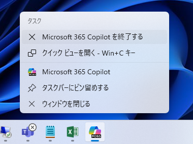 Microsoft 365のアイコンをマウスで右クリックします。 - 「Microsoft 365 Copilot を終了する」を選択する